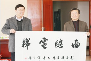 圖為書法家蕭云儒為西繼電梯題詞并與公司董事長、總經理劉金忠合影留念
