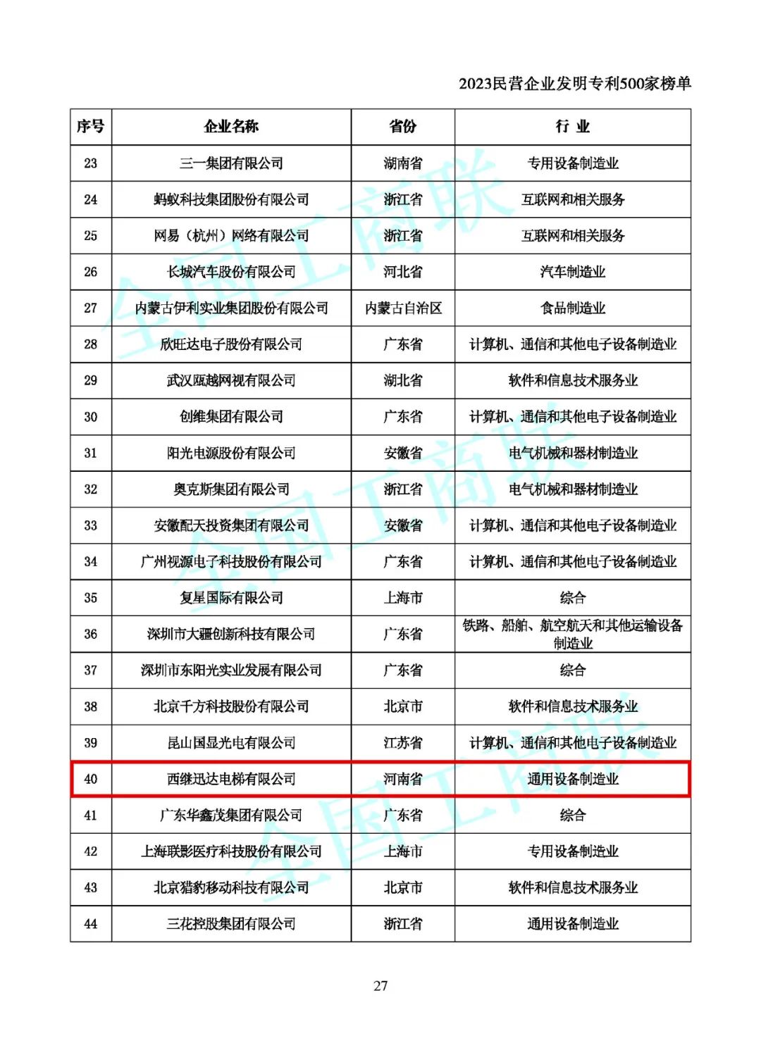 10 月 19 日,2023 全國民營企業(yè)科技創(chuàng)新與標準創(chuàng)新大會在長沙舉行。中央統(tǒng)戰(zhàn)部副部長,全國工商聯(lián)黨組書記、常務(wù)副主席徐樂江出席會議。據(jù)悉,會上發(fā)布了 2023 民營企業(yè)發(fā)明專利500 家榜單,8 家河南民營企業(yè)上榜,西繼迅達位列榜單。