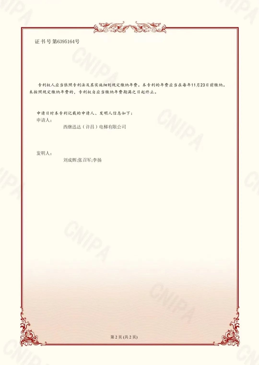 近期獲得的三項發明專利,帶上機械阻止裝置的一體式上梁,專利號ZL201811408505.6,專利申請日2018年11月23日,授權公告日為2023年10月13日,授權公告號CN109279471B;一種電梯驅動制動器電磁力測試裝置,專利號ZL201710717149.5,專利申請日2017年8月21日,授權公告號CN107462360B;背包式電梯導向系統 ,專利號ZL201810491625.0,專利申請日2018年5月22日,授權公告號CN108423520B,授權公告日為2023年8月29日,專利權限均為二十年。三項專利的成功獲得,是西繼迅達倡導科技創新和技術革新的實踐成果,再次展現了集團公司技術研發人員的科研素質和能力。 截止目前,今年西繼迅達共獲得授權發明專利授權5項、發明專利公布7項,實用新型專利授權18項。