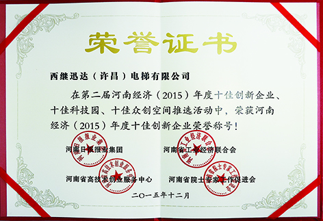 在2015年12月18日召開(kāi)的河南省第四屆產(chǎn)業(yè)集聚區(qū)高峰論壇上,西繼迅達(dá)電梯被授予“河南經(jīng)濟(jì)2015十大創(chuàng)新企業(yè)”稱號(hào),并獲得大會(huì)表彰。