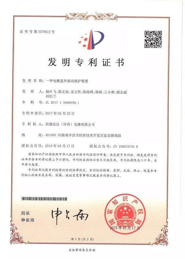日前,“一種電梯意外移動(dòng)保護(hù)裝置”被正式授予發(fā)明專(zhuān)利證書(shū)。專(zhuān)利權(quán)人為西繼迅達(dá)電梯,專(zhuān)利號(hào)為ZL201710096039.1,該專(zhuān)利于2017年2月22日申請(qǐng),授權(quán)公告日為2019年5月17日,授予公告號(hào)為CN106672735B。