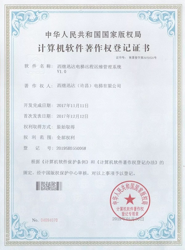 2019年5月30日,《西繼迅達電梯遠程運維管理系統》被正式授予《中華人民共和國國家版權局計算機軟件著作權登記證書》,登記號為2019SR0550068。