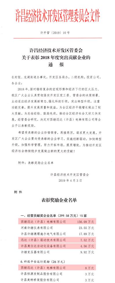 4月12日,西繼迅達(dá)電梯在經(jīng)濟(jì)技術(shù)開發(fā)區(qū)管委會(huì)召開的2019年度工作會(huì)議上,被開發(fā)區(qū)管委會(huì)通報(bào)表?yè)P(yáng),授予經(jīng)營(yíng)貢獻(xiàn)獎(jiǎng),并給予156萬元現(xiàn)金獎(jiǎng)勵(lì),位列經(jīng)營(yíng)貢獻(xiàn)獎(jiǎng)企業(yè)首位。此外,西繼迅達(dá)還被授予8萬元科技平臺(tái)運(yùn)行獎(jiǎng)勵(lì)。