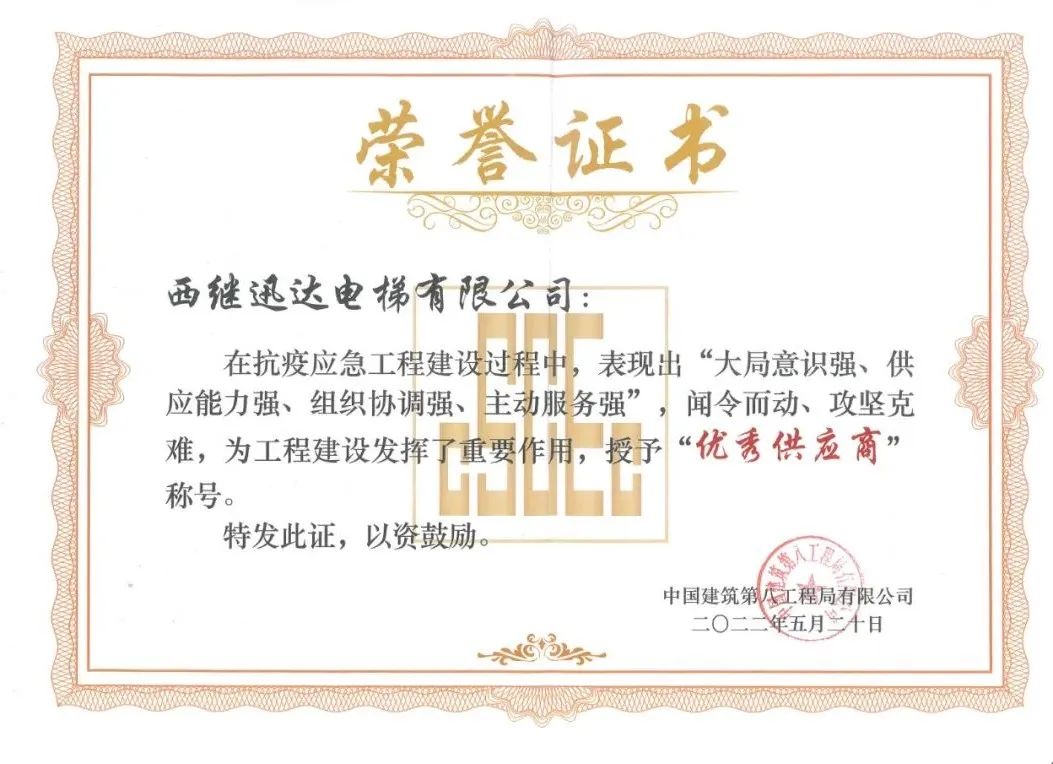 西繼迅達被評為“優秀供應商”